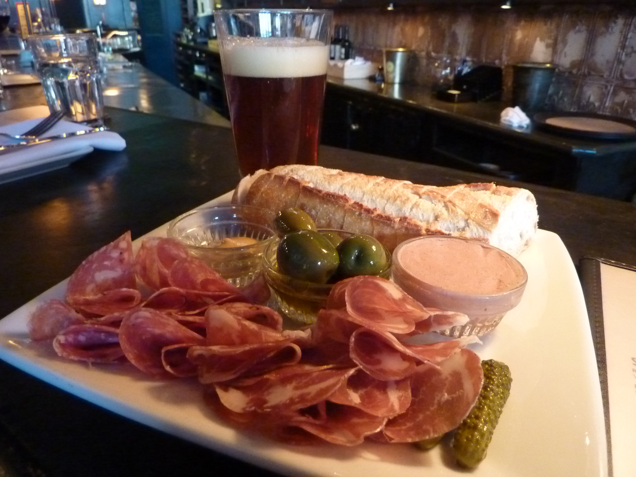 This afternoon the Charcuterie Plate was ordered (coppa, dry salumi, sicilian olives, house pate, mustard, bread) along with the day’s wine tasting selection and a Stone Double Bastard ale. http://www.portaliswines.com/