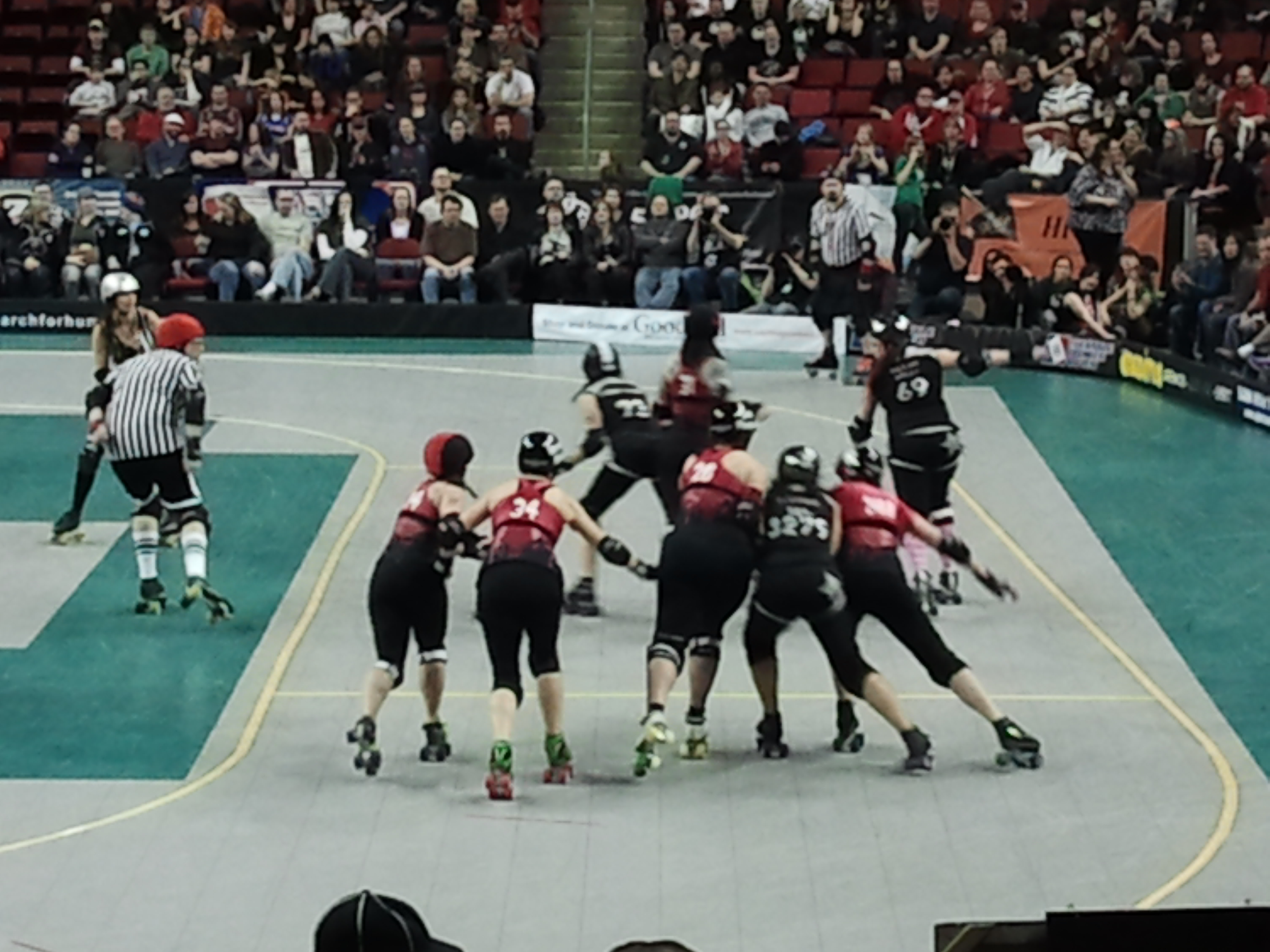 The Rat City Rollergirls league is made up of the following four teams – Throttle Rockets, Grave Danger, Sockit Wenches, and Derby Liberation Front (DLF). One word: Interesting. On this night, all four teams were playing…Sockit Wenches vs. DLF and Throttle Rockets vs. Grave Danger. Each game (considered a “bout”) consists of two 30 minute periods. The event is held at Key Arena at the Seattle Center, and yes, the food and drinks are just as expensive as they are at any other sporting event, although the popcorn is “bottomless”.