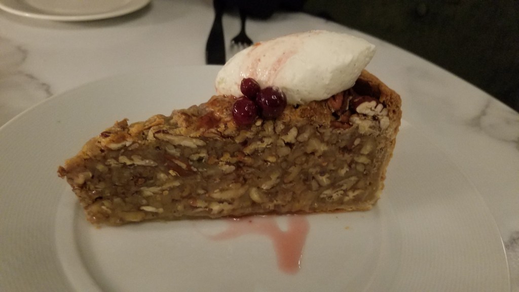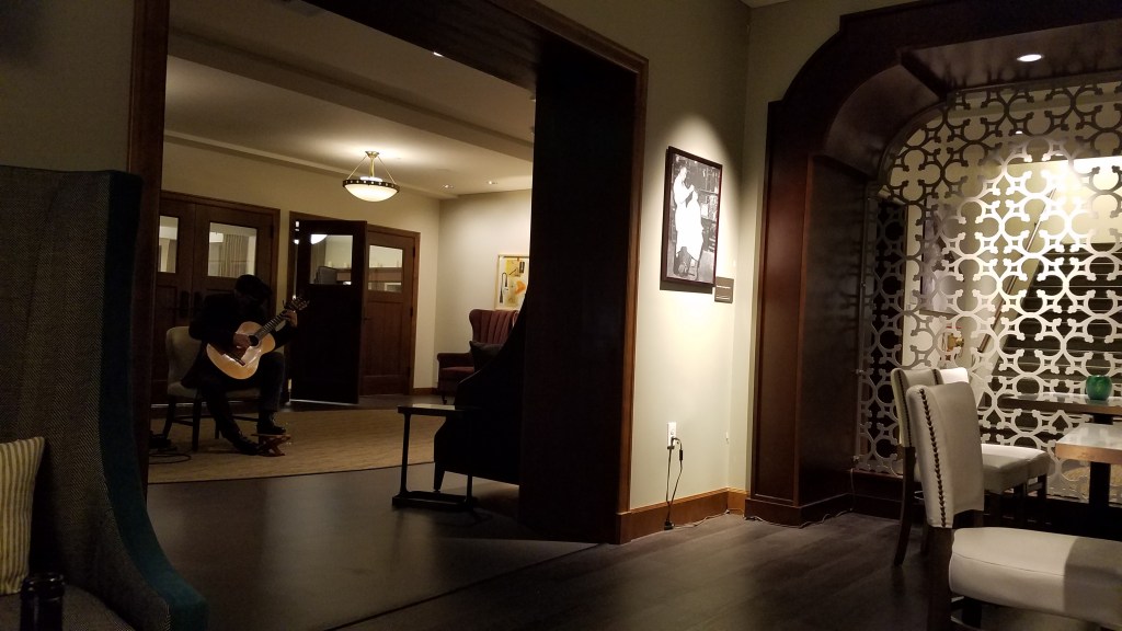 The second visit was for happy hour in The Tonsorium Bar located downstairs. The bar used to be a barbershop back in the day when the building was a seminary. Prior to the visit we were able to walk the grounds on the sunny winter day. Trees are my thing so I was in a happy place. As it was my husband’s birthday, we did it up well. We ordered the following and all was tasty: Pork Sandwich with fries, Local Oysters on the Half Shell, Artisan American Cheeses, Pate de Campagne, and Crisp Arancini Di Pulpi along with a sparkling wine and more. The description noted of the pecan torte was ‘off the hook’ – pure pecan bliss without the sugary mess. Katie is fabulous!!! Also, enjoyed the chat and neo-flamenco guitar performance of Andre Feriante. https://www.andreferiante.com/